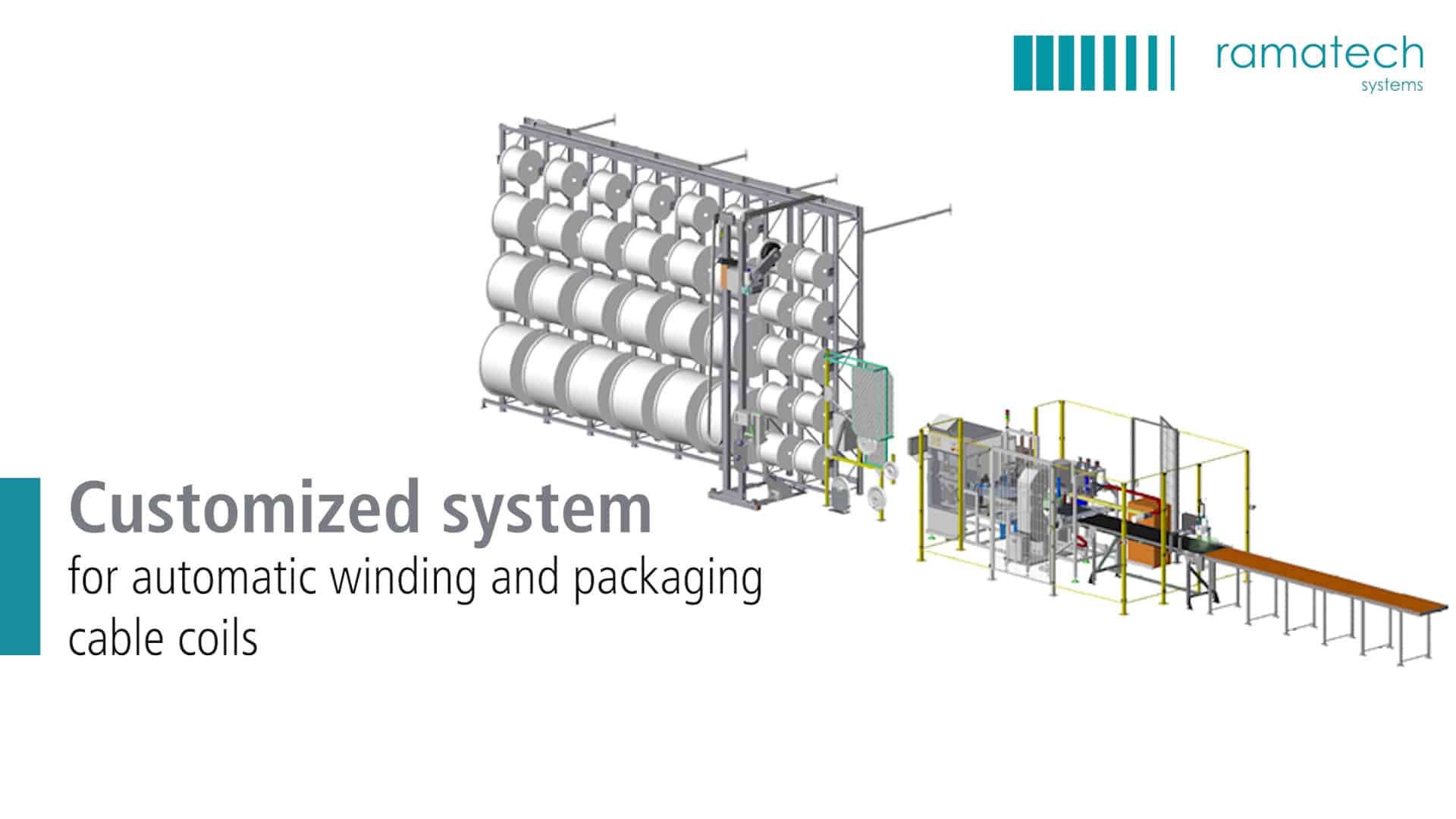 Ramatech not only offers systems for winding cable coils, but also has experience with packaging and therefore offers automatic cable winding and packaging systems. This means that you receive not just a single machine, but a complete, fully automatic production line with, for example, a cable reel storage system, cable ring winding machine, packaging system and conveyor system.